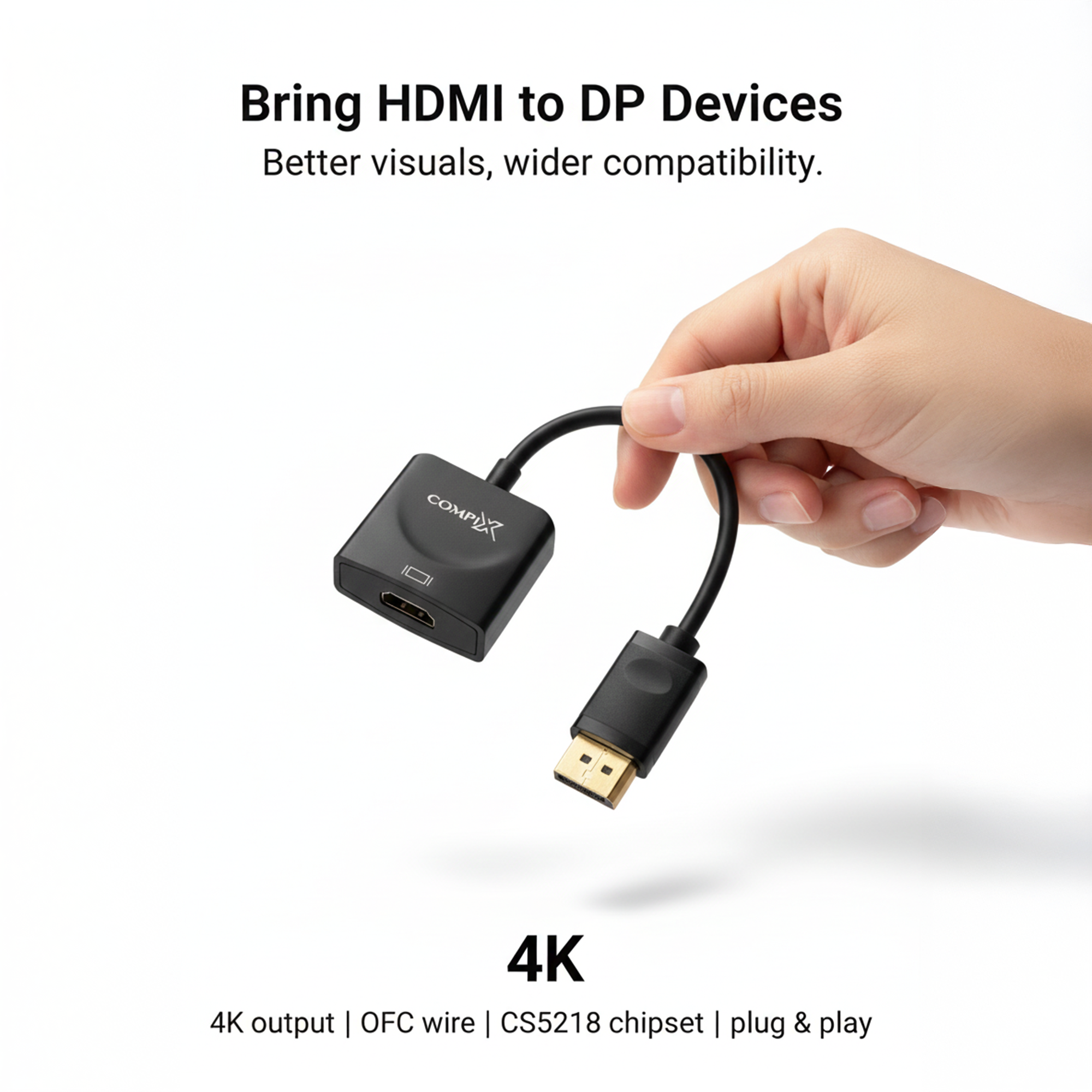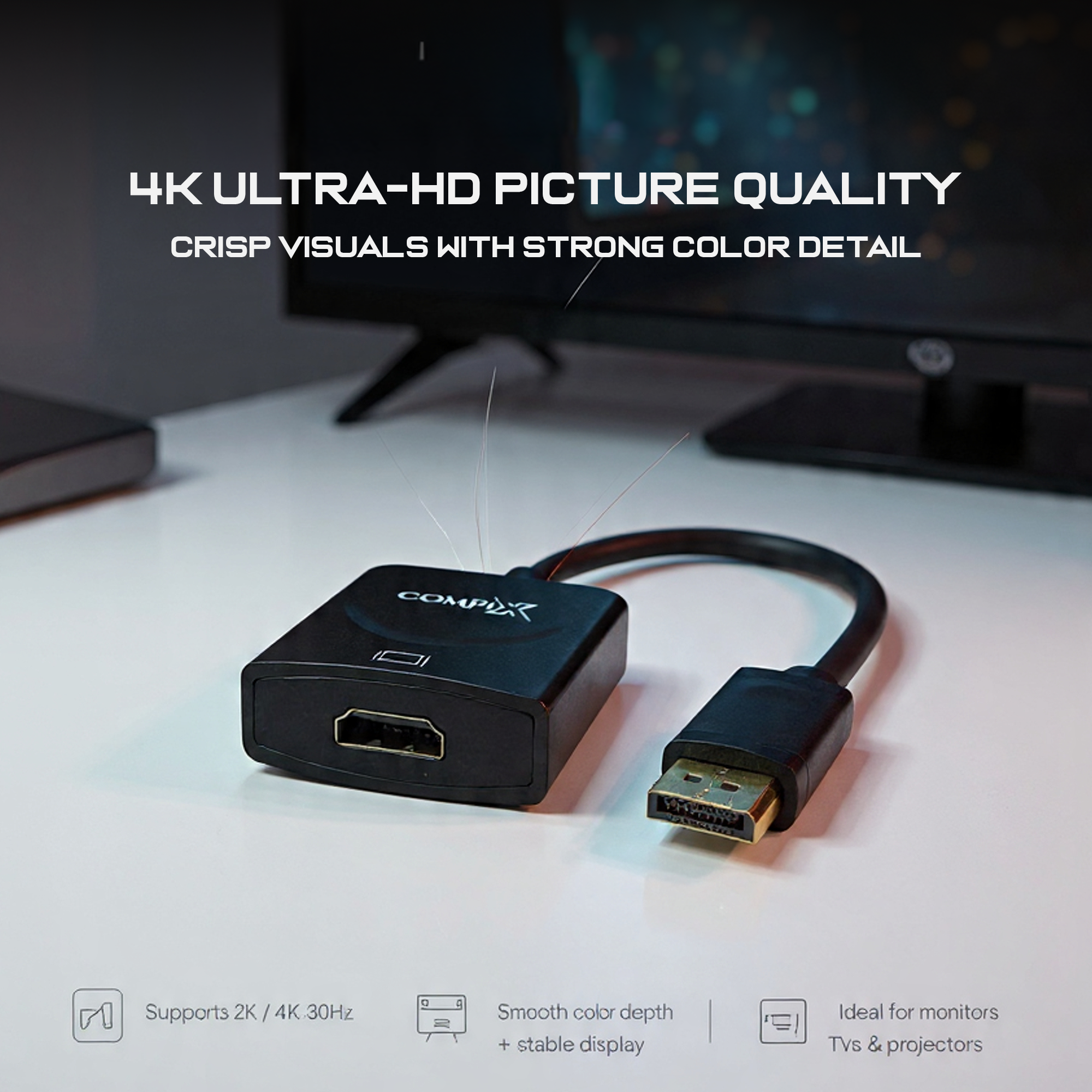 Connect your DisplayPort-enabled laptop or PC directly to an HDMI monitor, TV, or projector with the COMPIX DisplayPort to HDMI Adapter. Designed for stable 4K video output and seamless compatibility, this compact converter makes it easy to mirror or extend your display without extra drivers or software.