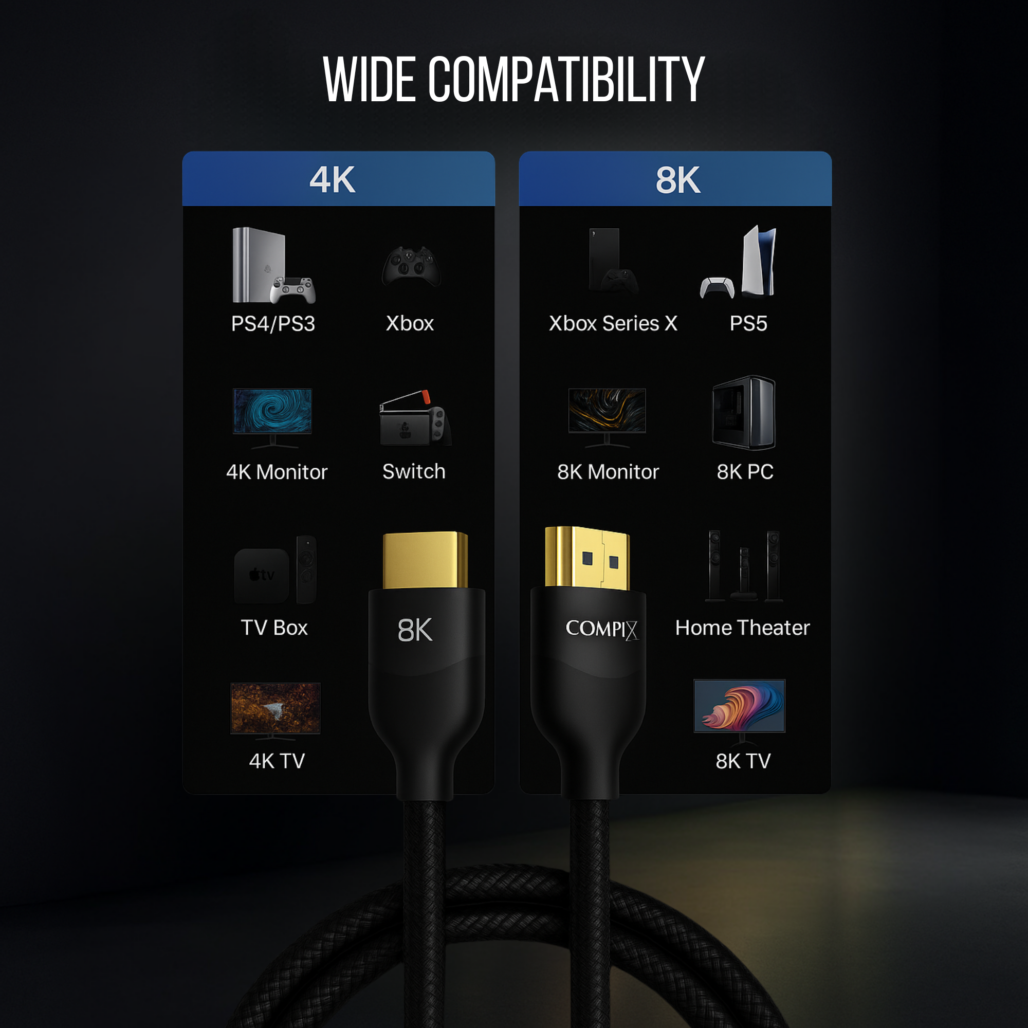 Unlock the full power of next-gen displays with the COMPIX HDMI 2.1 Cable, engineered for ultra-fast 48Gbps bandwidth, stunning 8K clarity, and ultra-smooth high refresh rates. Perfect for gaming, streaming, and home theater installations.