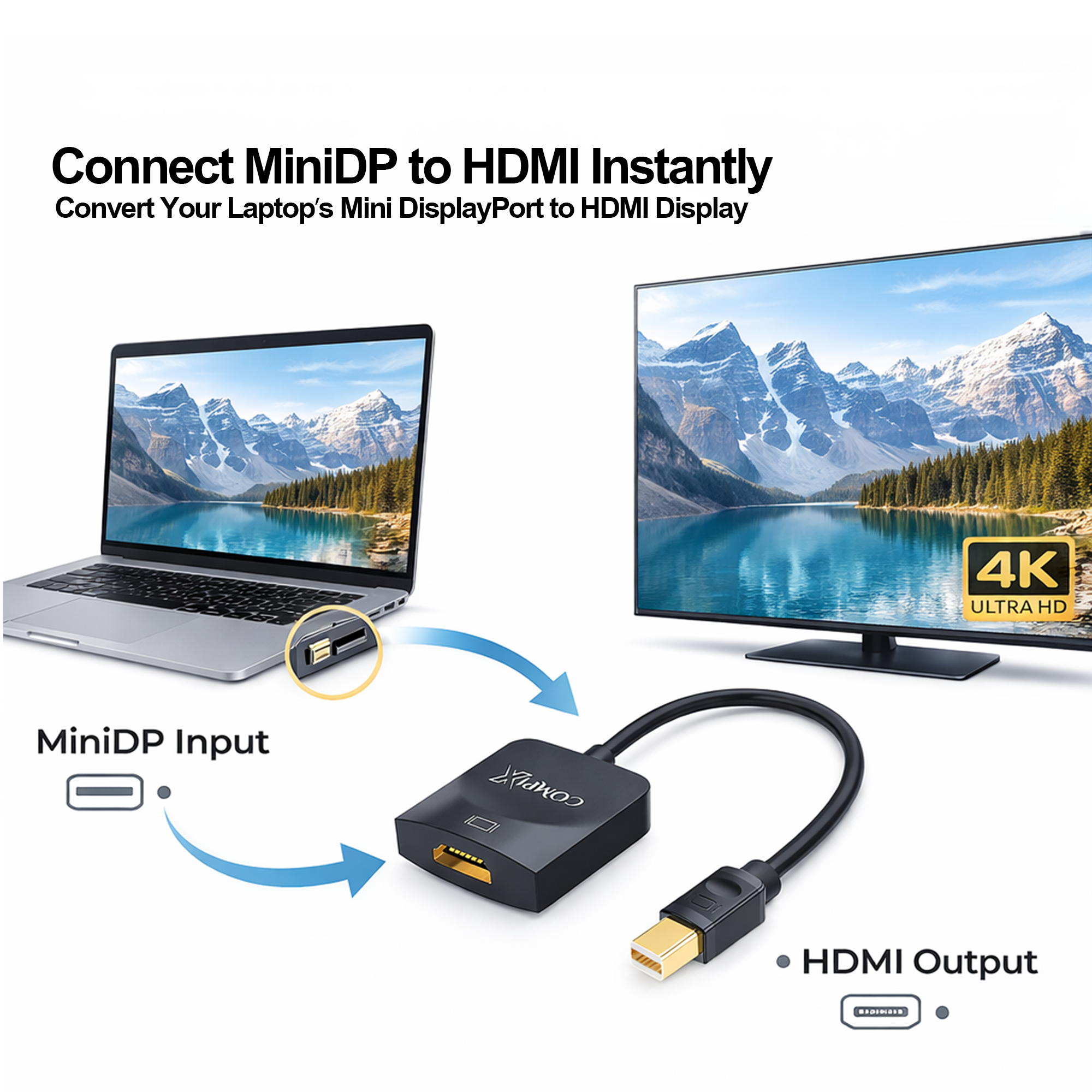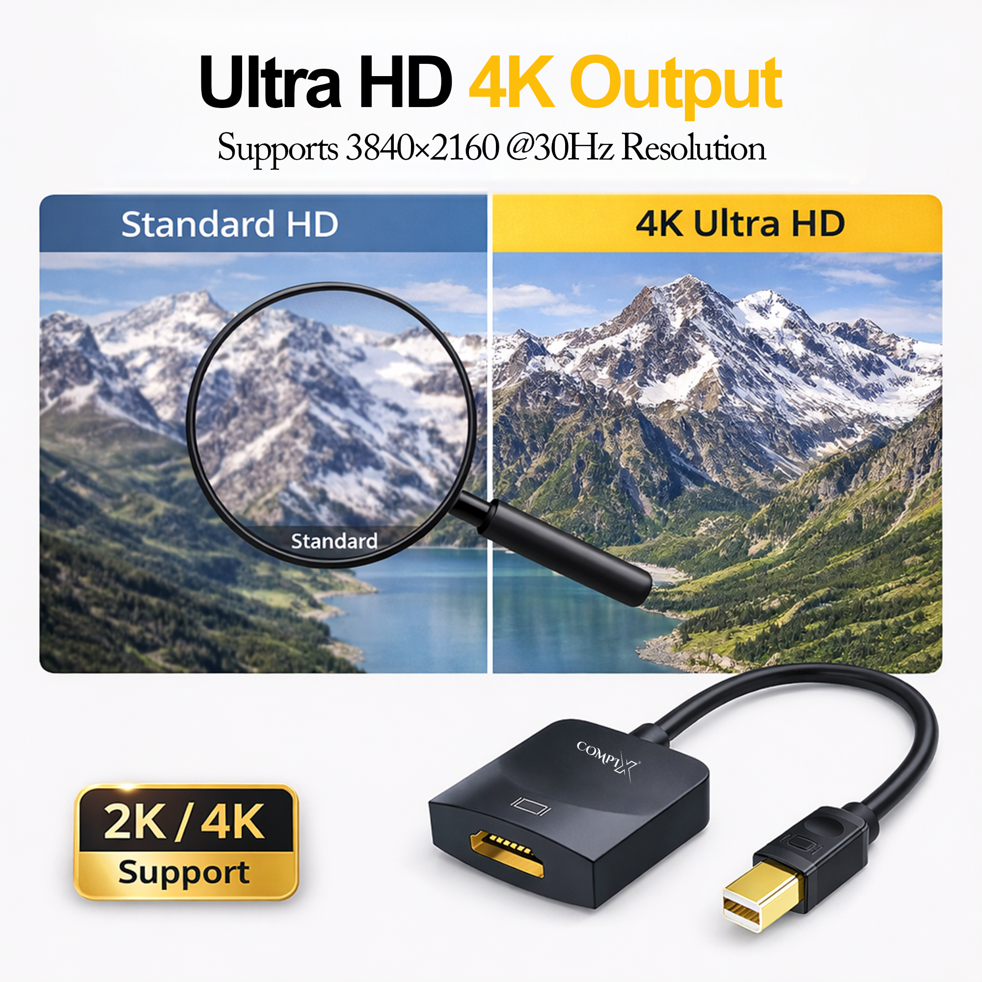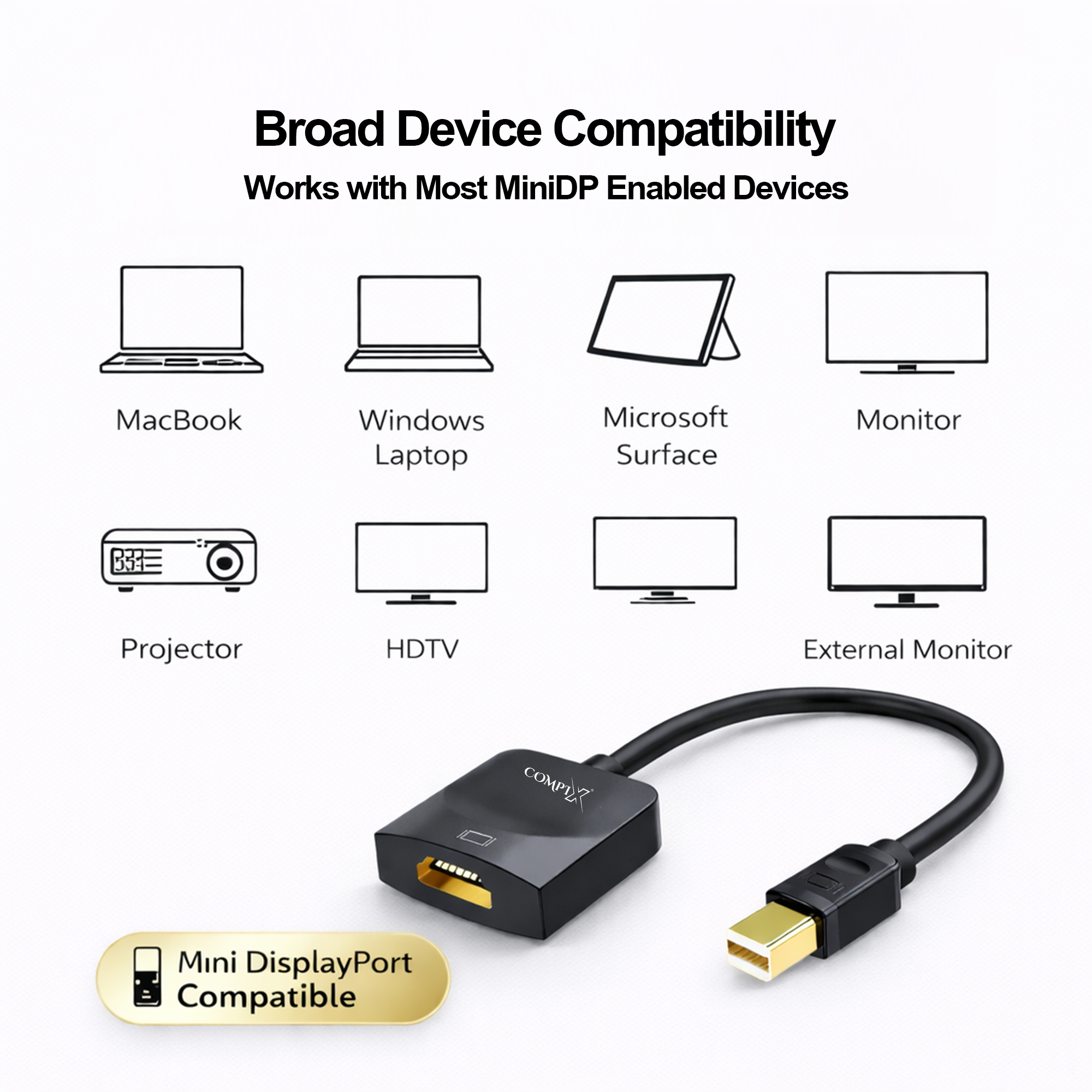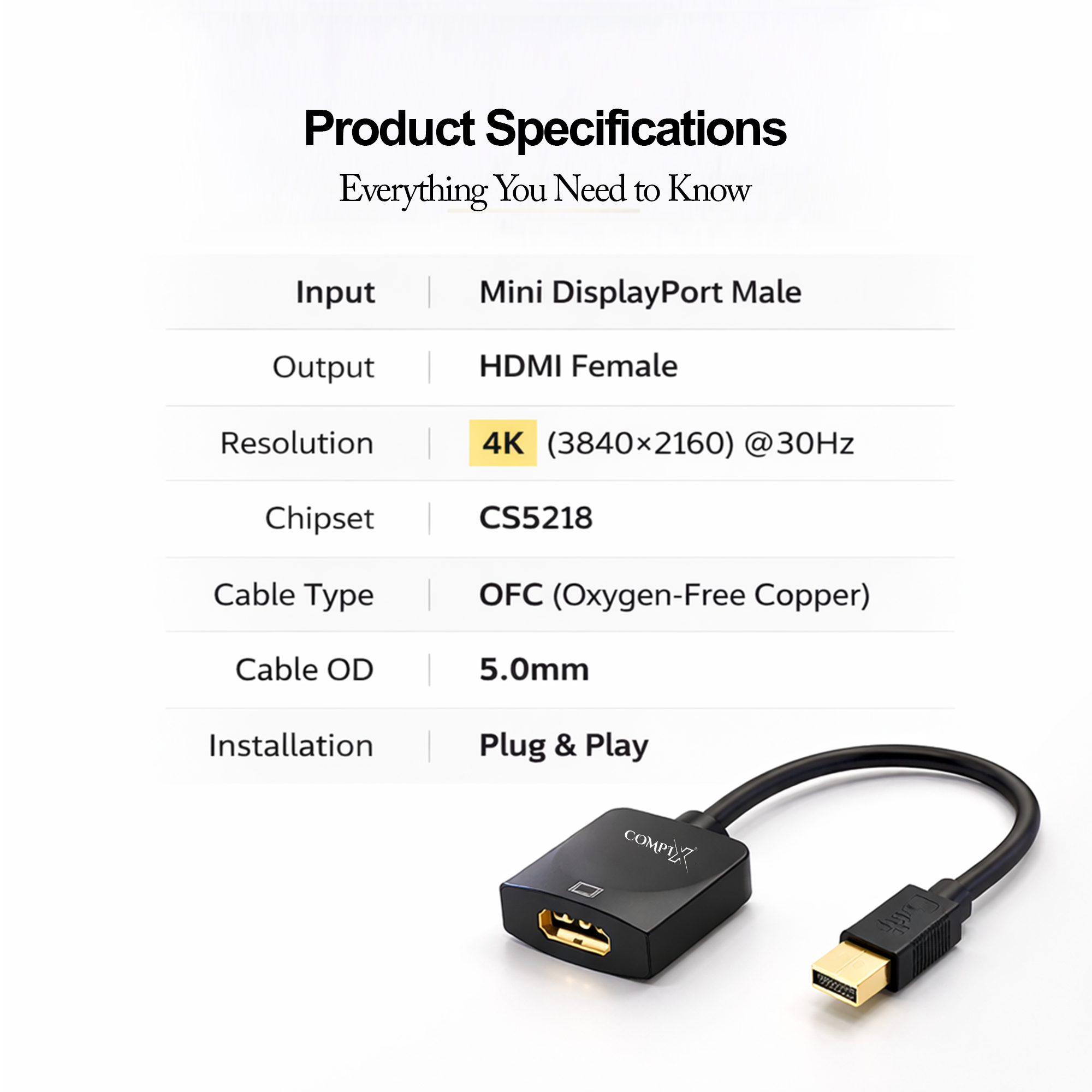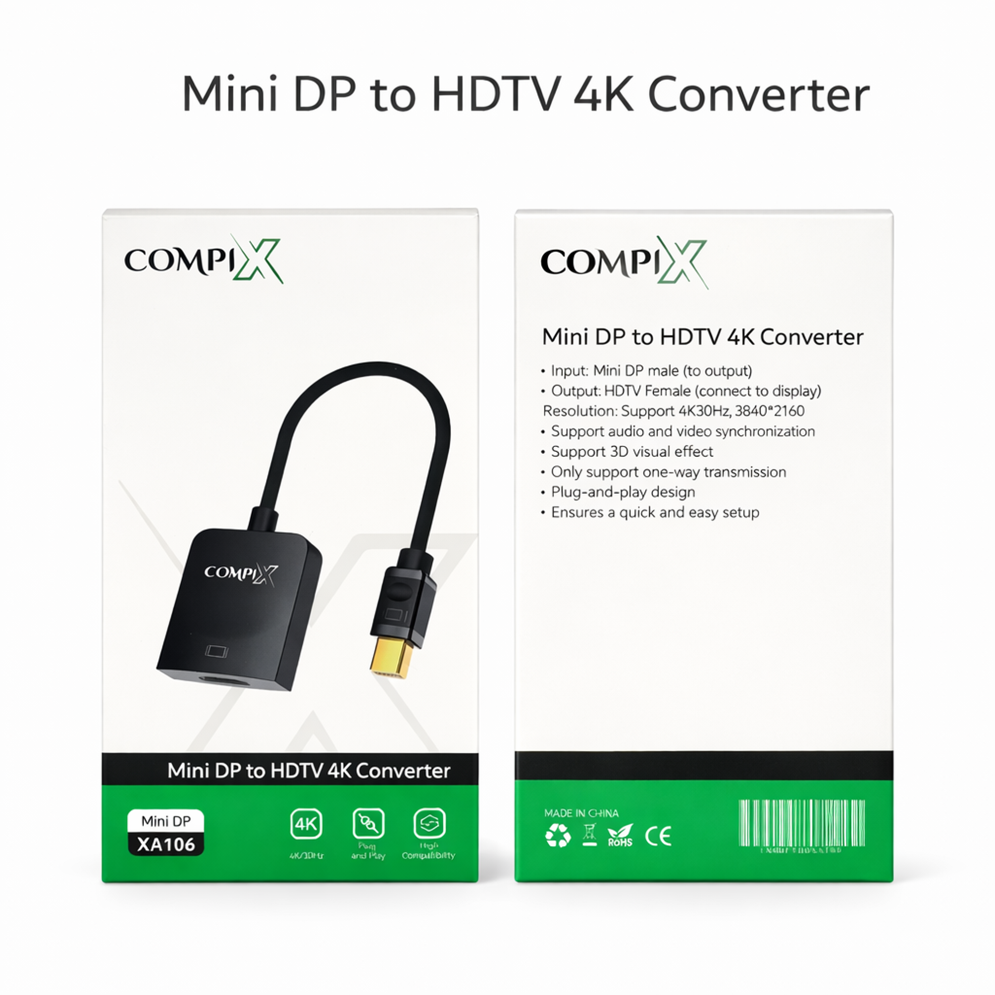 The COMPIX Mini DP to HDMI 4K Converter is designed to connect Mini DisplayPort-enabled devices to HDMI displays with reliable high-definition output. Supporting up to 4K resolution at 30Hz, it delivers sharp visuals and smooth performance for presentations, workstations, and home entertainment setups.
