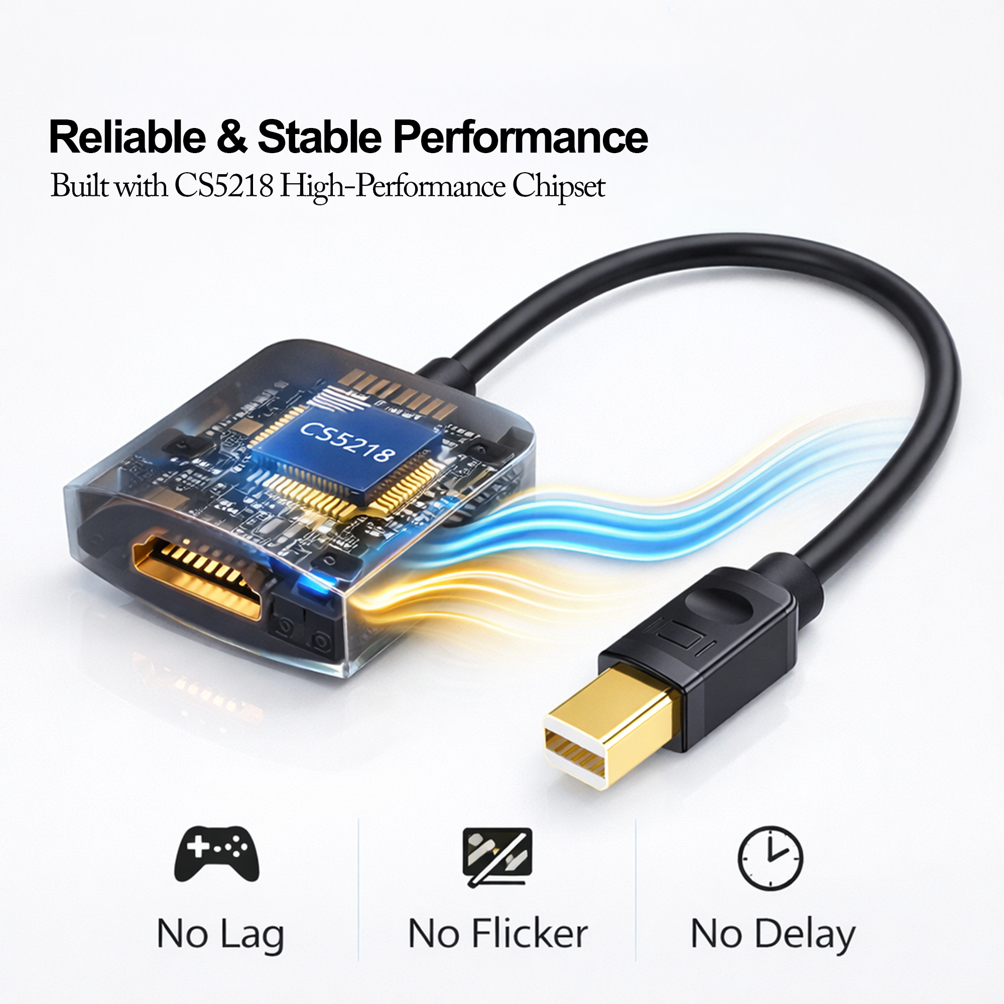 Featuring a Mini DisplayPort male input and HDMI female output, it allows easy connection between laptops, desktops, and HDMI monitors or TVs. With plug-and-play functionality, no drivers or additional software installation is required.